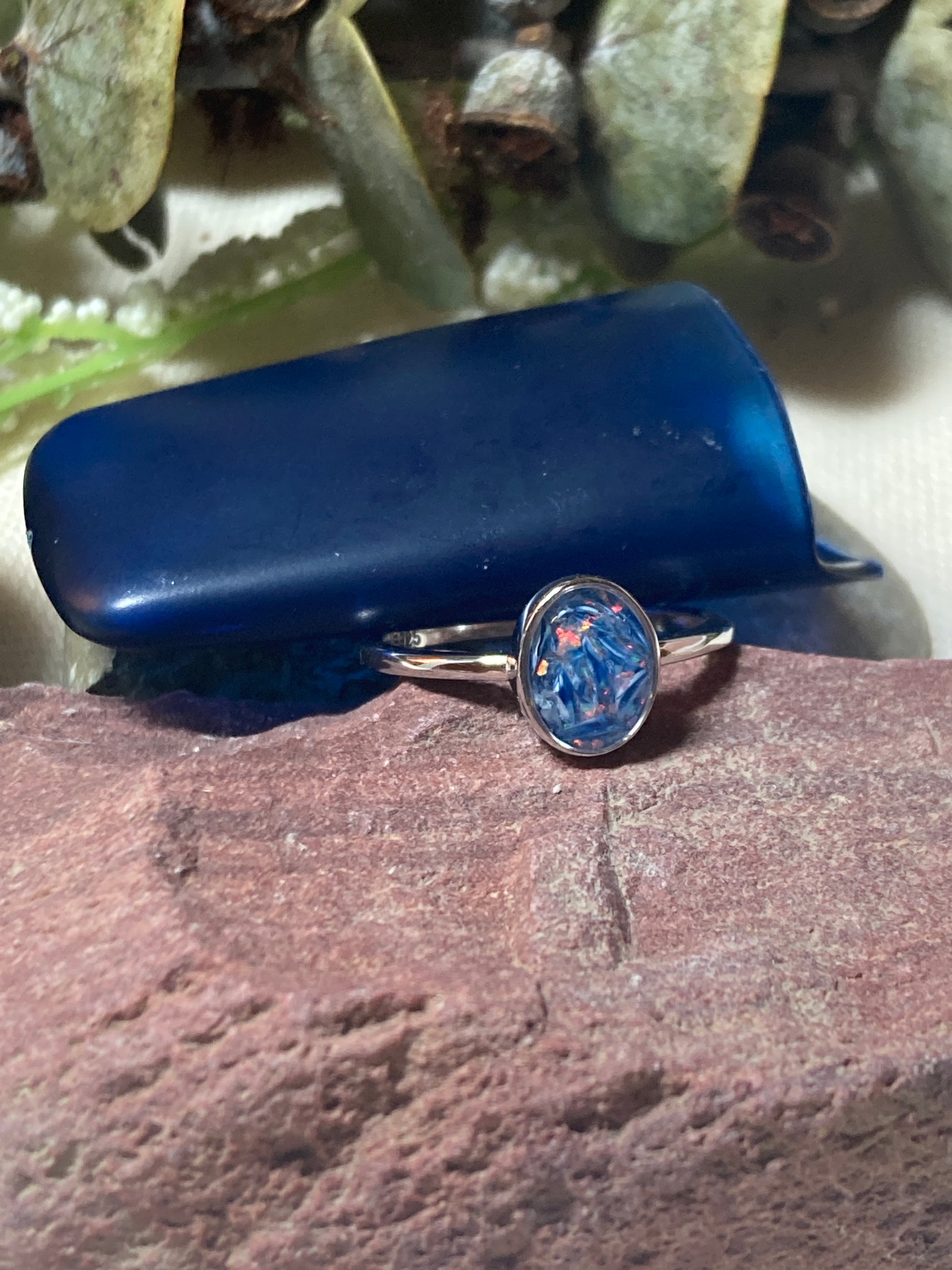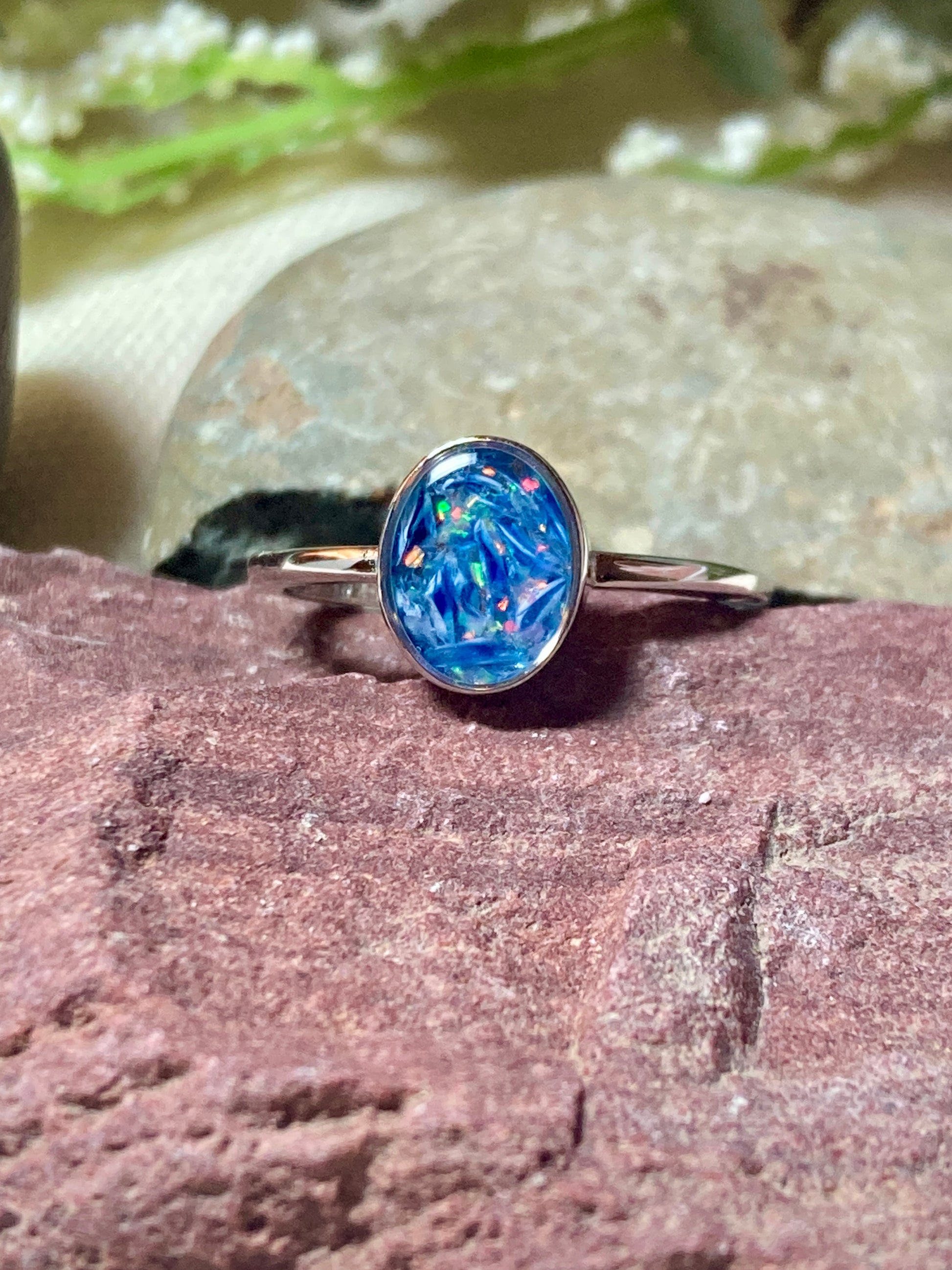 This ring features pieces of a pregnancy test cap. The ring pictured also has opal and gold flakes added. Please add these separately if you would like to add these to your stone.